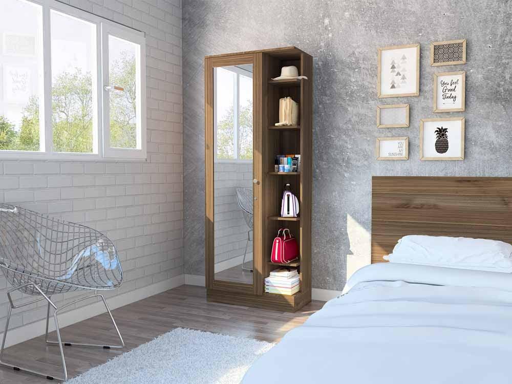 Closet Lara con Espejo, Castaño, con Siete Entrepaños y Gran Capacidad de Almacenamiento