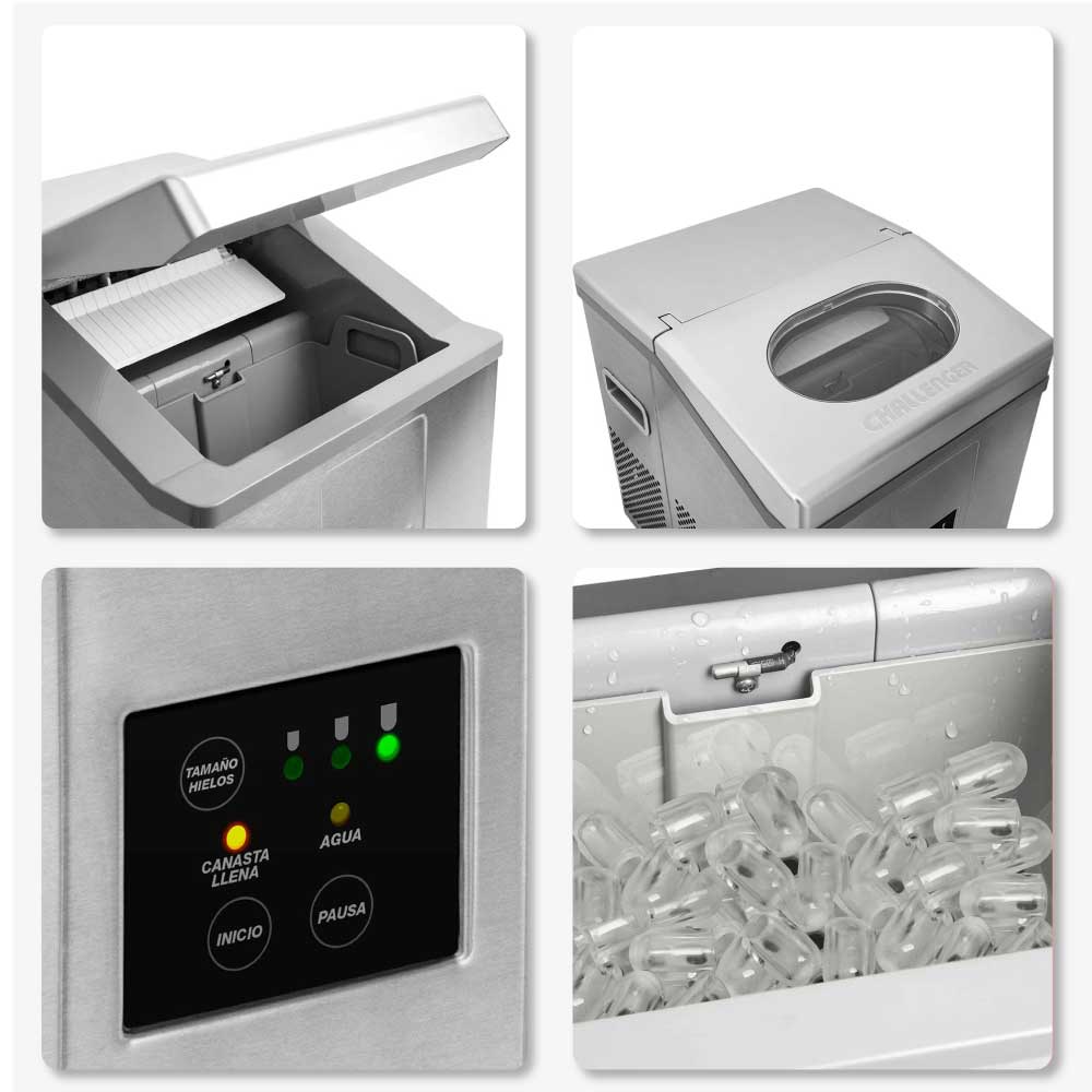 Electrónico multifunción que permite seleccionar el tamaño de los hielos (3 tamaños) / 15 Kg en 24 horas / capacidad de almacenamiento 1,4 kg de hielo / Tapa con ventana Transparente