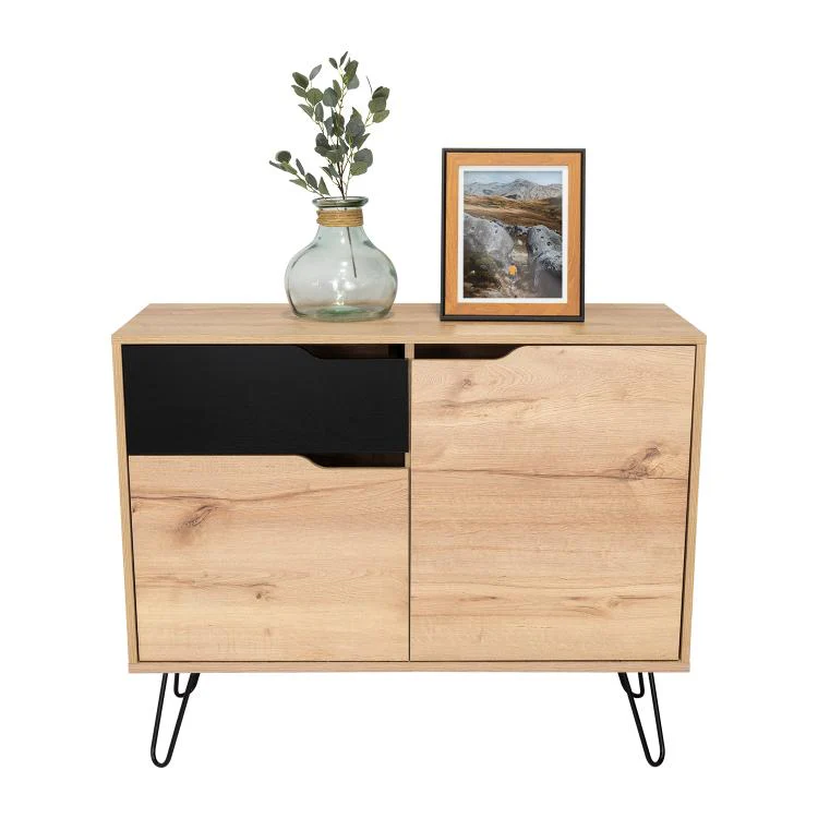 Mesa Auxiliar Recibidor, con 2 puertas, diseño moderno con combinación de colores, un cajón de extensión total y apertura sin manija, patas metálicas y amplio espacio.