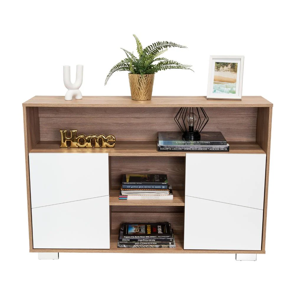 Mesa Auxiliar Recibidor Orus, Miel y Blanco, con Cuatro Puertas y Patas de Acero